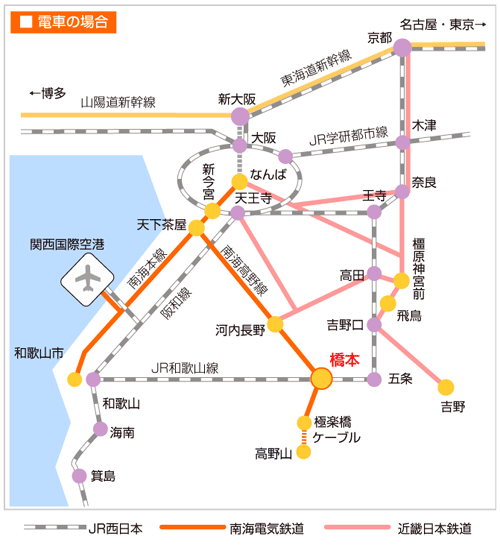 - 難波←(29分)→河内長野←(23分)→橋本←(41分)→極楽橋←(ケーブル約5分)→高野山