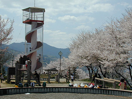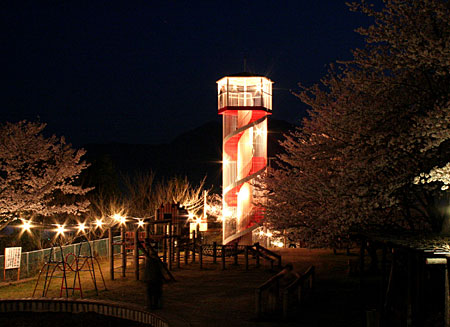 紀ノ川筋随一の桜の名所として有名です。春の開花時期には夜間点灯があり、 夜桜が楽しめます。 住所:高野口町名倉 交通:JR和歌山線高野口駅下車北に徒歩5分 駐車施設:10台 ※桜祭の期間(3/25〜4/8)は諸車進入禁止です。 施設:キャンプ場・公衆トイレ有り Counter: 11871, 展望台 夜桜とロサリオン
